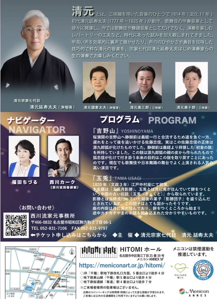 HITOMIホール KIYOMOTO ガラ・コンサート 2025 in名古屋 メニコンAWEX 吉野山 清元 演奏会 玉兎 KIYOMOTO ガラ・コンサート 2025 in名古屋 タイトル KIYOMOTO ガラ・コンサート 2025 in名古屋 日時 2025年9月9日(火) 1st Stage 13:302nd Stage 18:30 演目 「吉野山」「玉兎」 会場 HITOMIホール(メニコンAWEX 5F) 関連リンク 吉野山 解説&歌詞 玉兎 解説&歌詞 備考 関連画像(クリックすると拡大します)